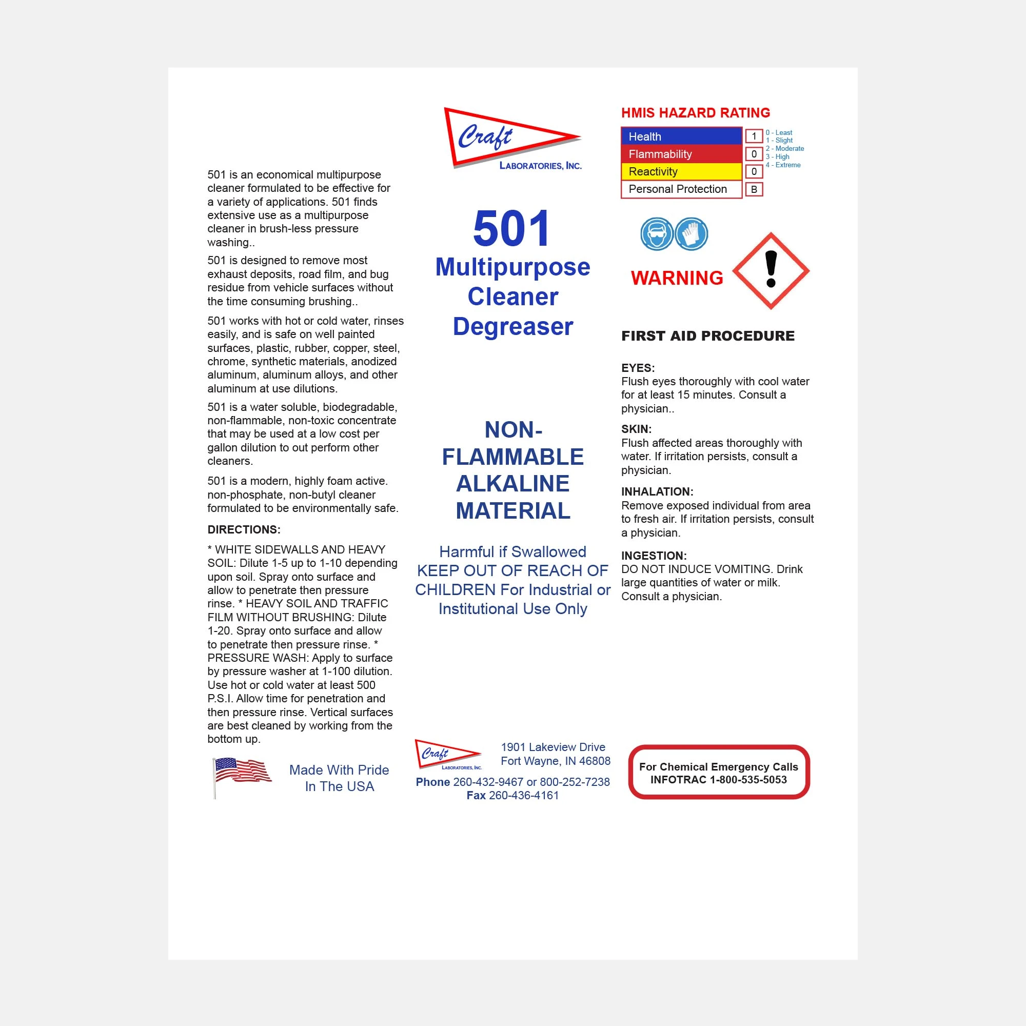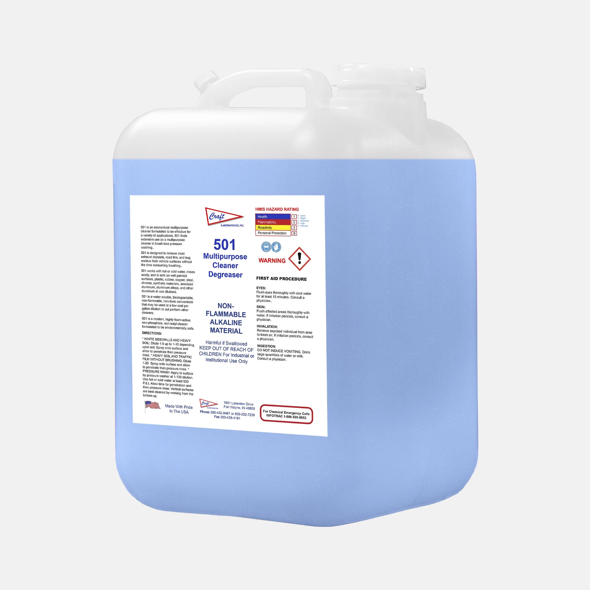 501 is an economical, concentrated multipurpose cleaner designed for maximum versatility in commercial and industrial washing. Safe on painted surfaces, plastics, metals, and synthetic materials, it rinses easily with hot or cold water and leaves surfaces clean without streaking. Its phosphate- and butyl-free formula is biodegradable, non-flammable, and non-toxic — making it as environmentally friendly as it is effective.