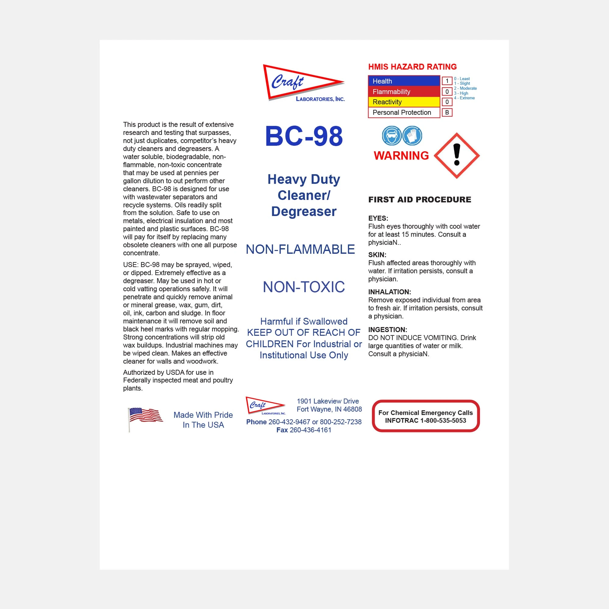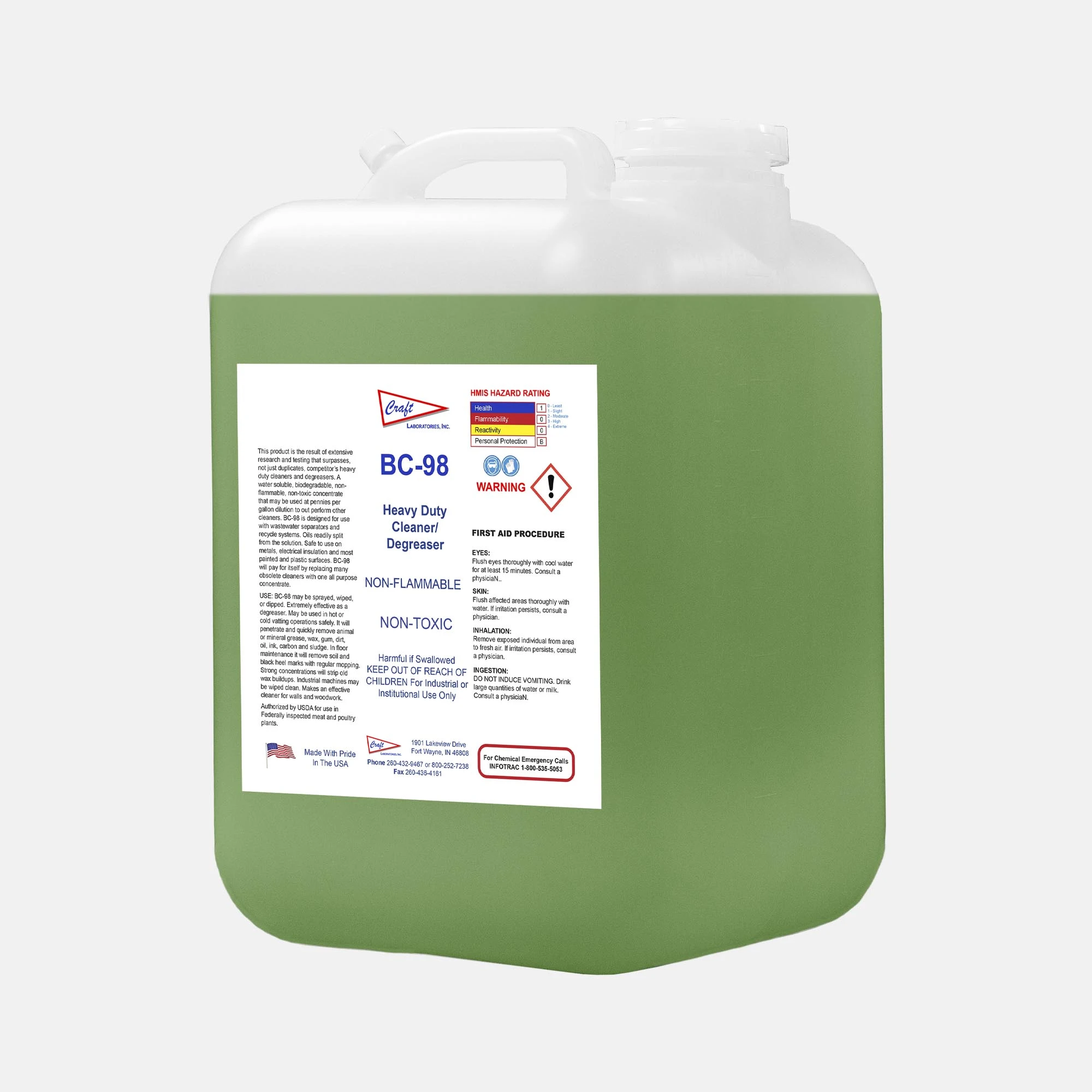 BC-98 H.D. Cleaner was originally designed for restaurant degreasing but quickly proved itself in broader industrial and institutional use. It penetrates and lifts animal and mineral grease, oils, wax, ink, and carbon from metals, insulation, painted, and plastic surfaces. USDA authorized, BC-98 doubles as a wall and woodwork cleaner while replacing the need for multiple obsolete products.
