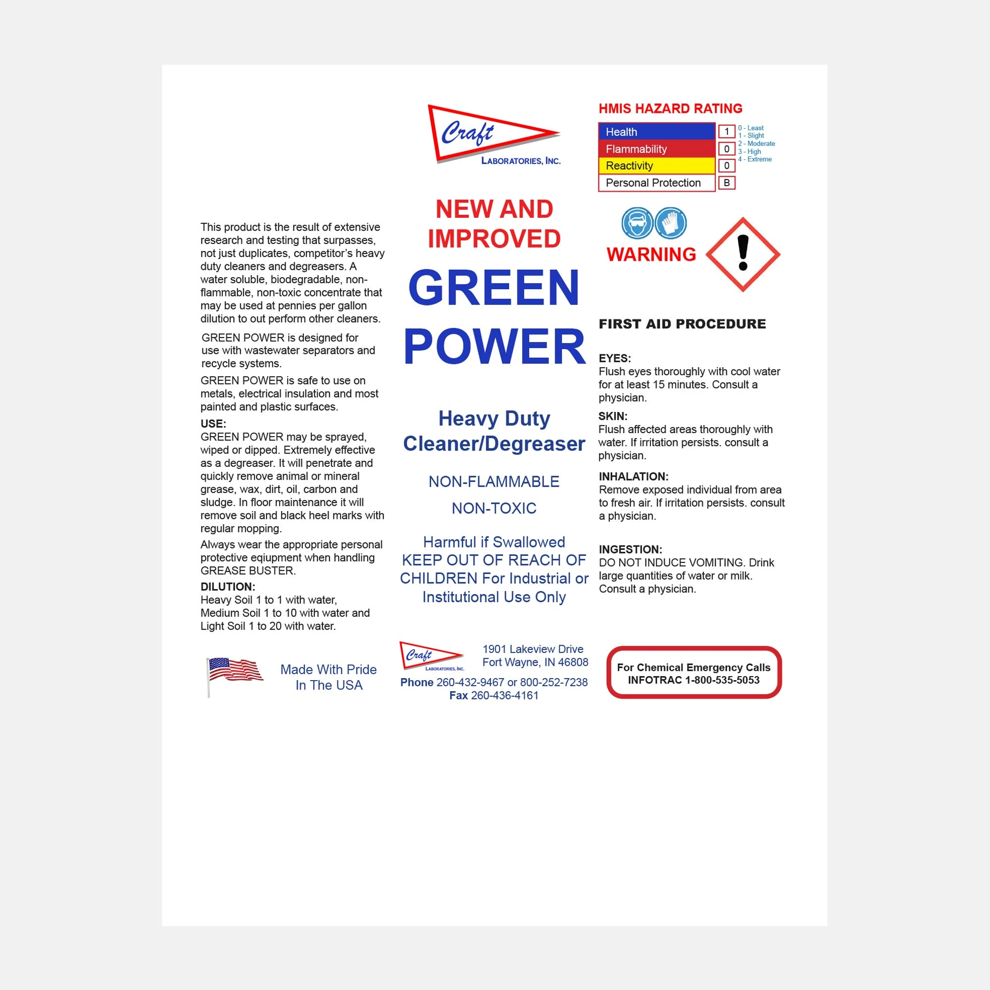 Green Power is a biodegradable, non-flammable, non-toxic degreaser designed for maximum performance at minimal cost. It cuts through grease, oil, dirt, and sludge quickly, leaving surfaces clean without harsh chemicals. Safe on metals, electrical insulation, and most painted surfaces, Green Power is ideal for wastewater systems, recycling facilities, and industrial floors.