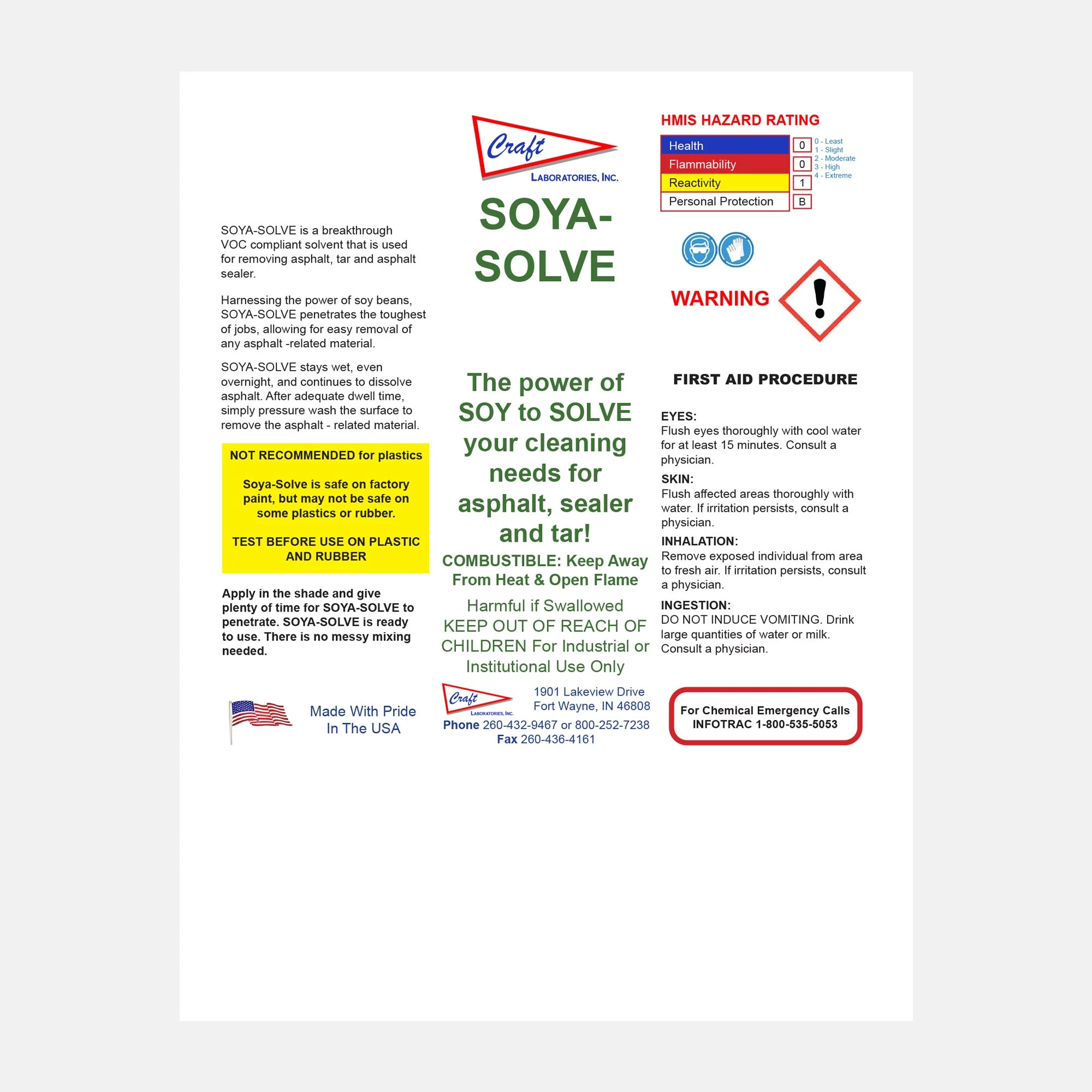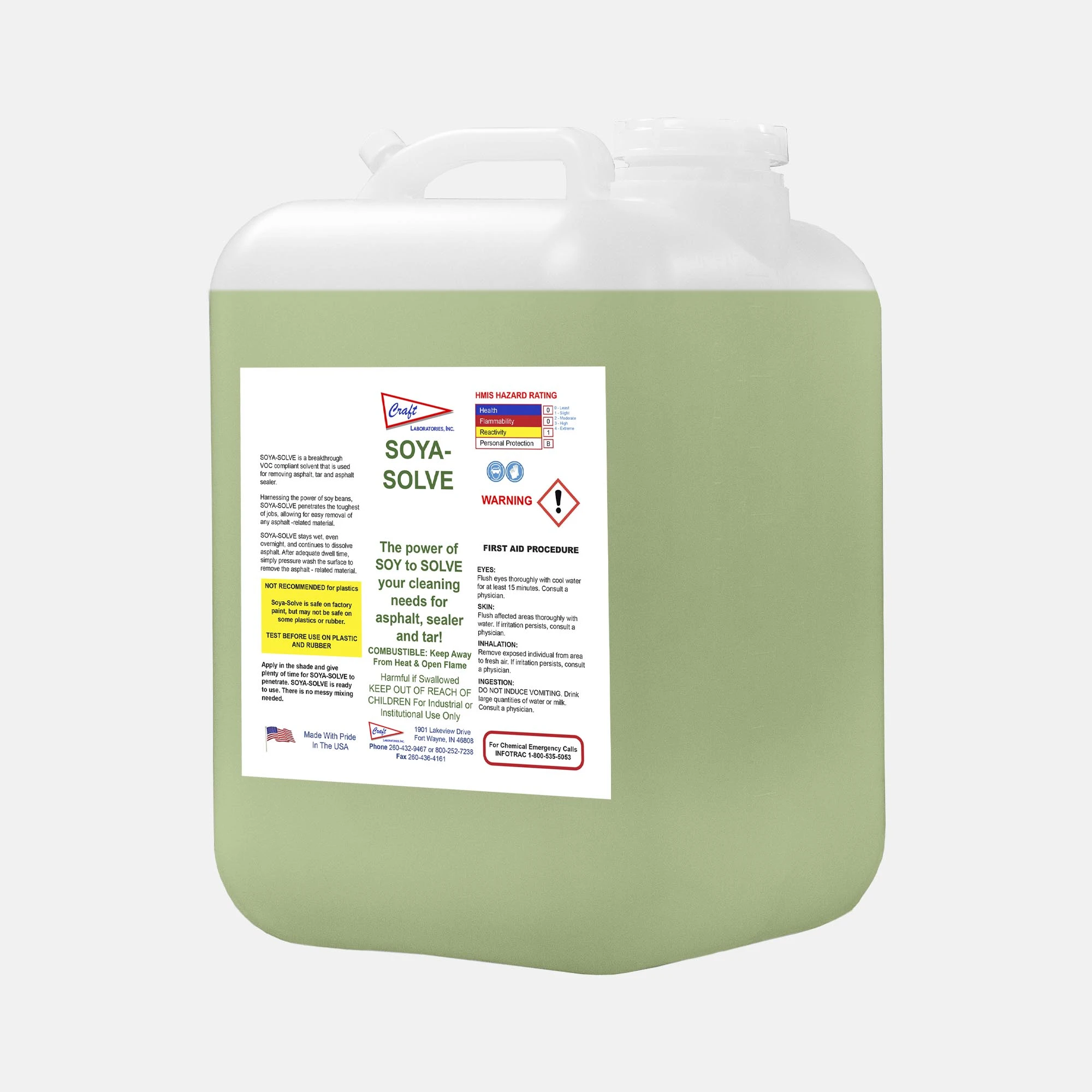 Soya-Solve is a VOC-compliant solvent made from soybeans, designed for removing asphalt, asphalt sealers, tar, adhesives, grease, and oil. It penetrates and loosens even tough or aged deposits, staying wet for hours for maximum cleaning power. Easily rinsed with a hot water pressure washer. Safe on metal, painted surfaces, and glass, but not recommended for plastics.