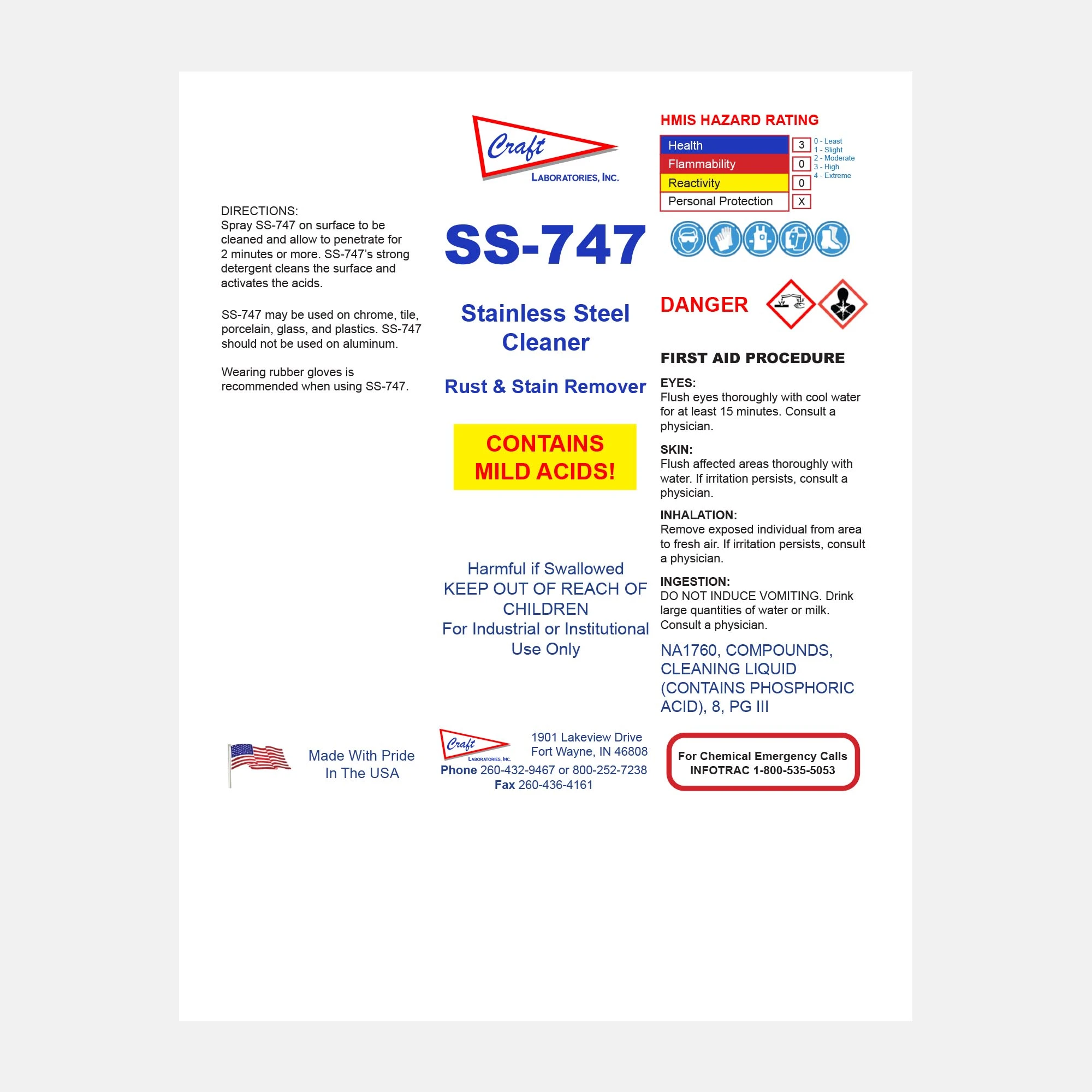 SS-747 contains mild acids. Use only with proper protective equipment and adequate ventilation. Avoid direct contact with skin and eyes, and always rinse surfaces thoroughly after application.