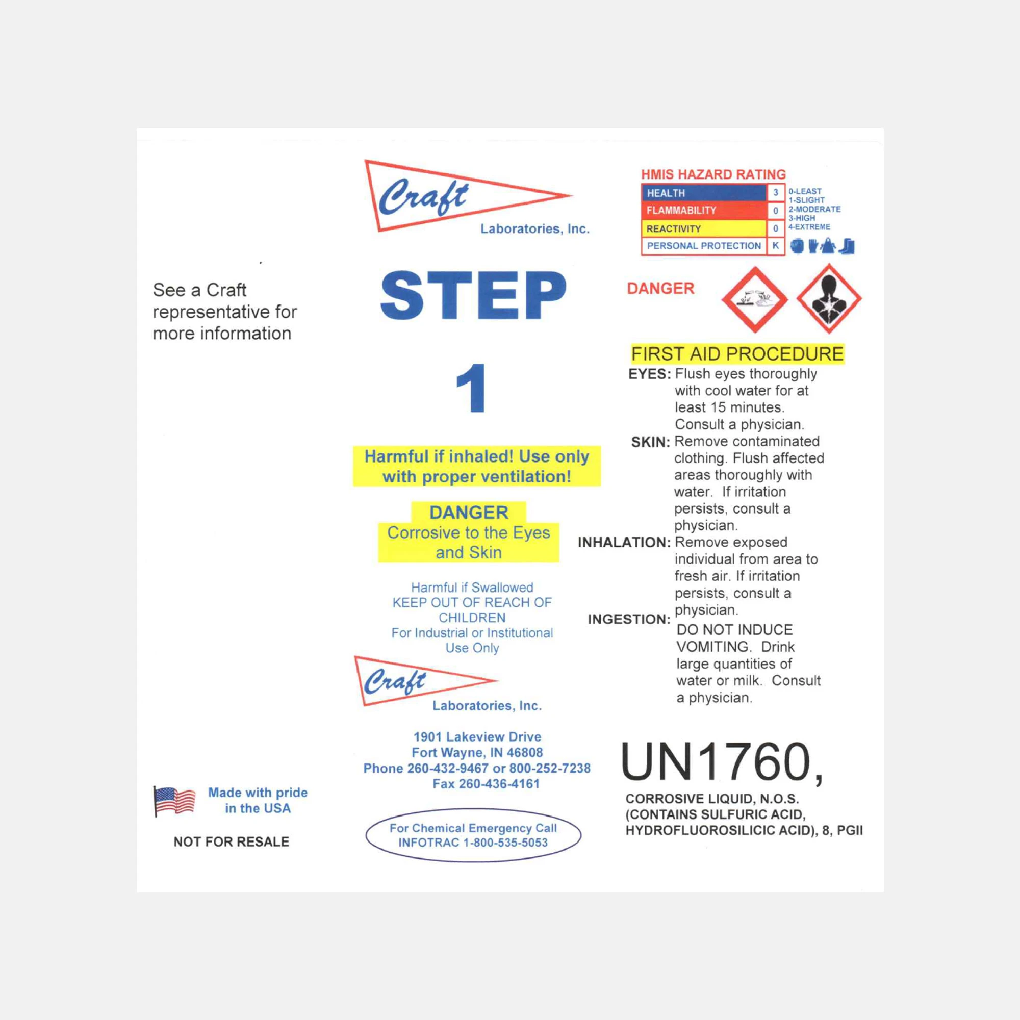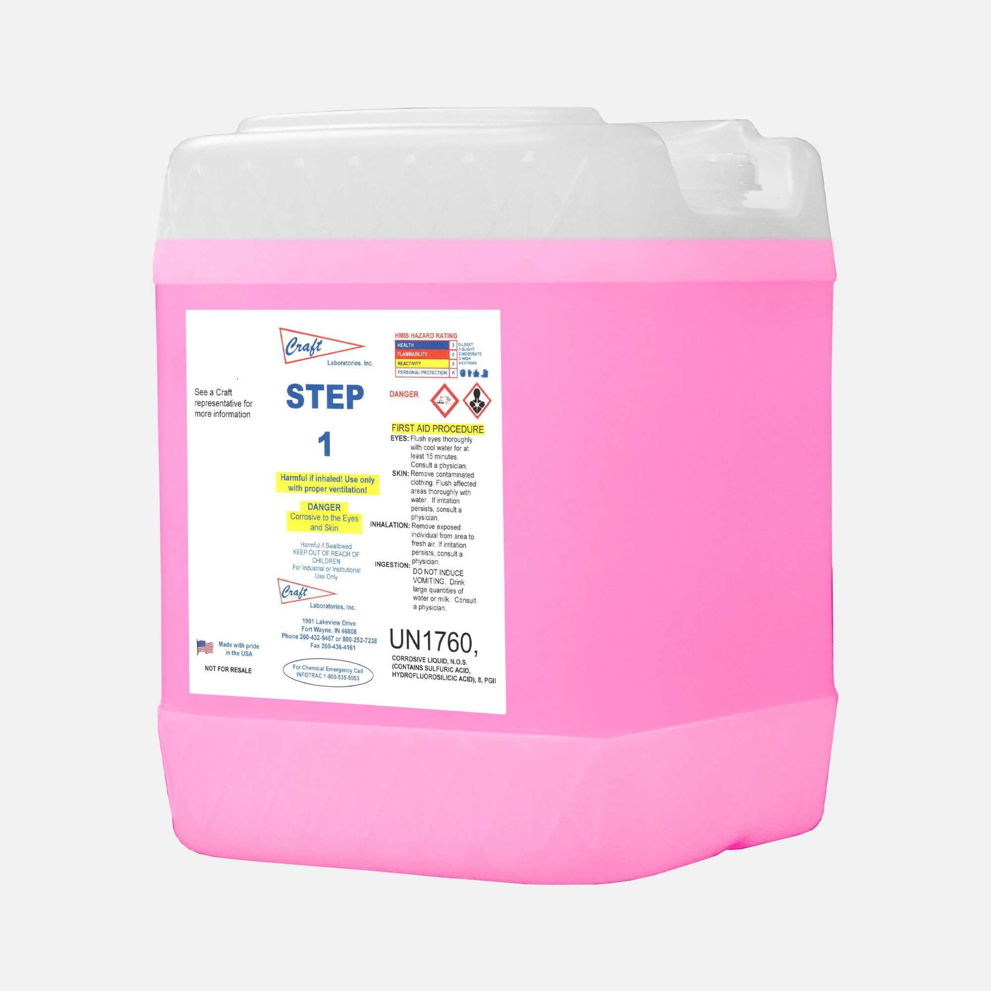 Step 1 is a high-strength cleaning solution designed for use in multi-stage industrial cleaning processes where maximum performance is required. Formulated with strong active acids, including sulfuric acid and hydrofluorosilicic acid, it delivers aggressive cleaning action for removing tough soils and buildup.