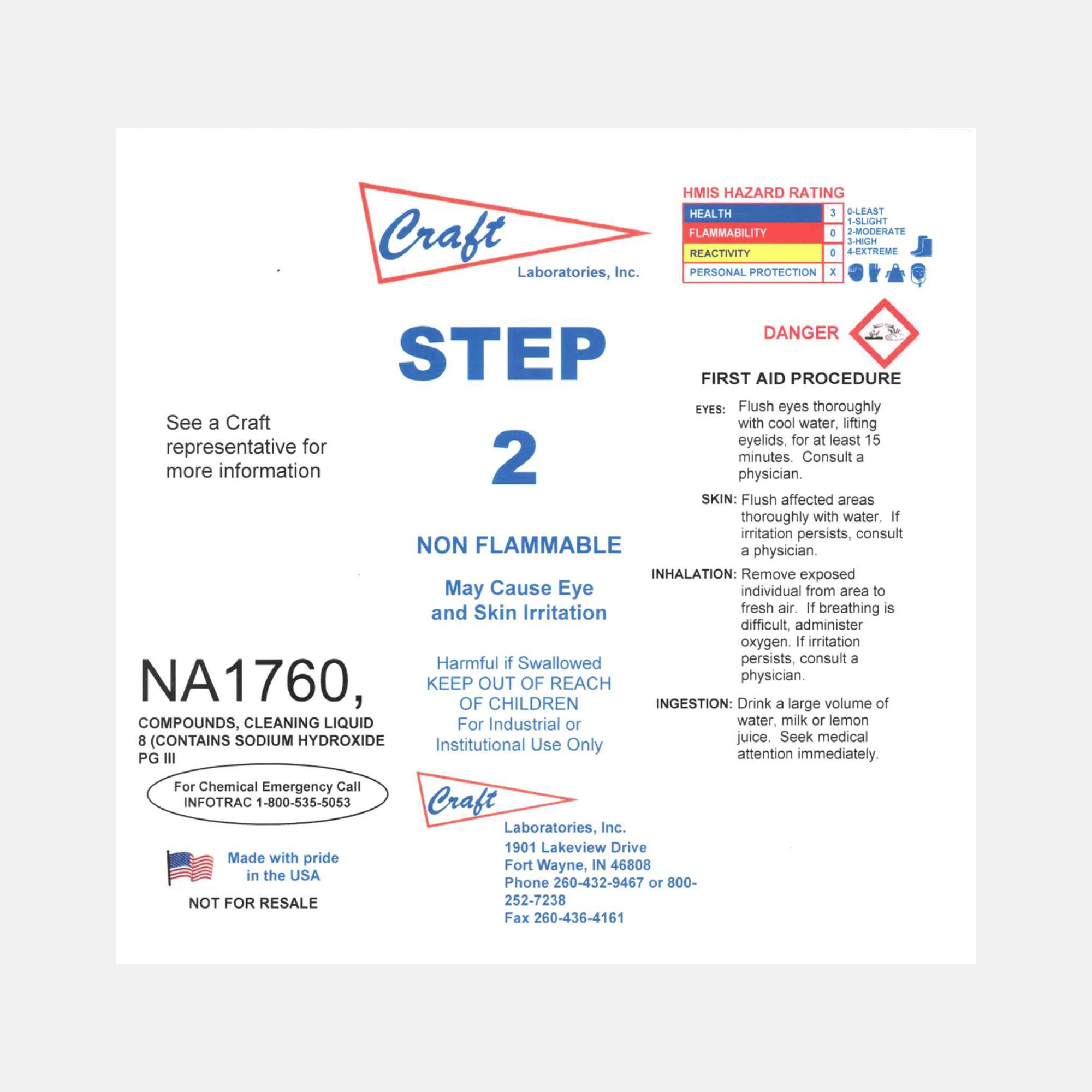 Step 2 is a heavy-duty cleaning compound designed for use in multi-stage cleaning systems where strong performance is required. Formulated with active cleaning agents, including sodium hydroxide, it effectively breaks down tough soils and contaminants.